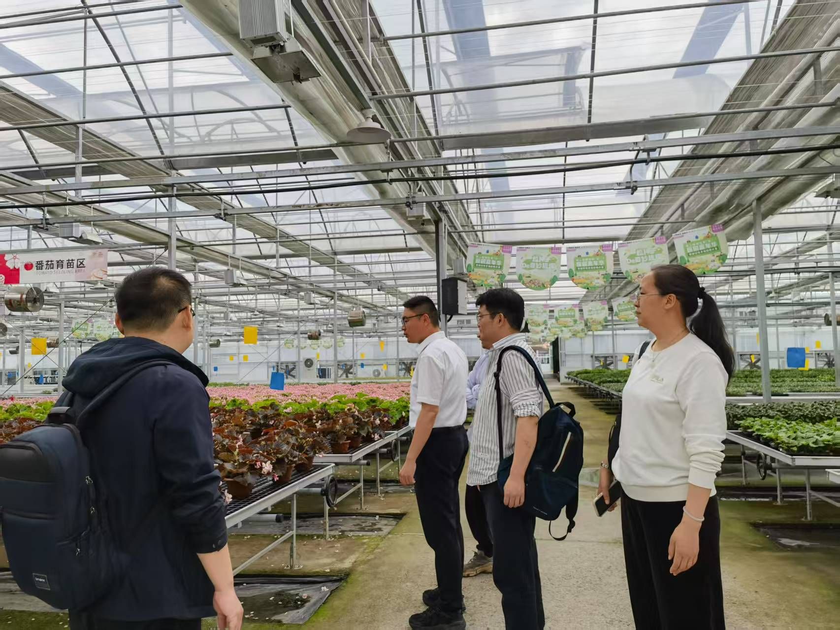 在植物科学中心,老师们依次参观育种科研温室、智能播种催芽车间、数字种苗工厂等现代农业科技设施,参观了番茄新品种示范推广温室和家庭农场经营模式。随后,在农创中心参观了农创工坊街,了解“前店后坊”的农创产业模式。