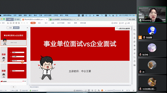 王翠老师以面试中应注意的外在形象与内在内容入手,重点介绍了面试的各种形式及特点、面试考察重点、面试过程中应注意的事项三方面,并就历年事业单位面试真题为同学们进行了演练,帮助同学们具体掌握面试答案重点与答题流程。在培训的最后,老师也围绕大家在面试中遇到的问题和困惑进行一对一解答和指导。