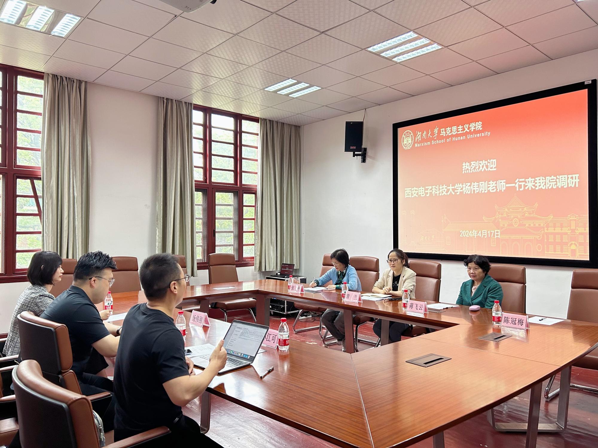 (通讯员 高宇璇)为不断加强与全国重点太阳成集团tyc122cc的交流,共同探索跨地区高校太阳成集团tyc122cc“手拉手”集体备课机制建设,4月17日上午,太阳成集团tyc122cc教师代表杨伟刚一行赴湖南大学开展调研活动。湖南大学太阳成集团tyc122cc思想道德与法治教研部部长、支部书记曾兰,教授蒋飞云,副教授张平等参加了此次调研活动。