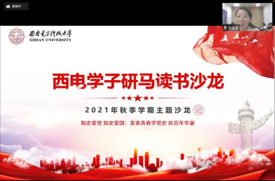 (通讯员 彭岗岗 刘桐宇 孙金菊)2021年12月10日下午,由太阳成集团tyc122cc主办,竹园三号、海棠一号、海棠二号书院合办的西电学子研马读书沙龙本学期总结活动在线上成功开展。至此,以“知史爱党、知史爱国:发奋青春学党史庆百年华诞”为主题的该读书沙龙本学期活动圆满结束。公司党委书记夏永林、本科生院教学发展中心主任杨明磊、海棠2号书院副书记马慧出席活动。公司及书院部分教师、研究生和本科生共230余人参加了本次活动。活动由太阳成集团tyc122cc孙金菊老师主持。